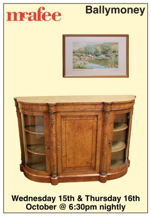While many sales are held on owners' premises McAfee Auctions hold regular sales of antique and general furnishings and fine art sales in their own Auction Rooms in Ballymoney, Ballycastle and Loughgall Co. Armagh. Under the personal supervision of Gerard McAfee M.R.I.C.S, F.N.A.V.A, F.N.A.E.A. each sale is widely advertised, itemised and catalogued, afforded ample time for viewing and brought to a satisfactory conclusion.