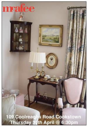 While many sales are held on owners' premises McAfee Auctions hold regular sales of antique and general furnishings and fine art sales in their own Auction Rooms in Ballymoney, Ballycastle and Loughgall Co. Armagh. Under the personal supervision of Gerard McAfee M.R.I.C.S, F.N.A.V.A, F.N.A.E.A. each sale is widely advertised, itemised and catalogued, afforded ample time for viewing and brought to a satisfactory conclusion.